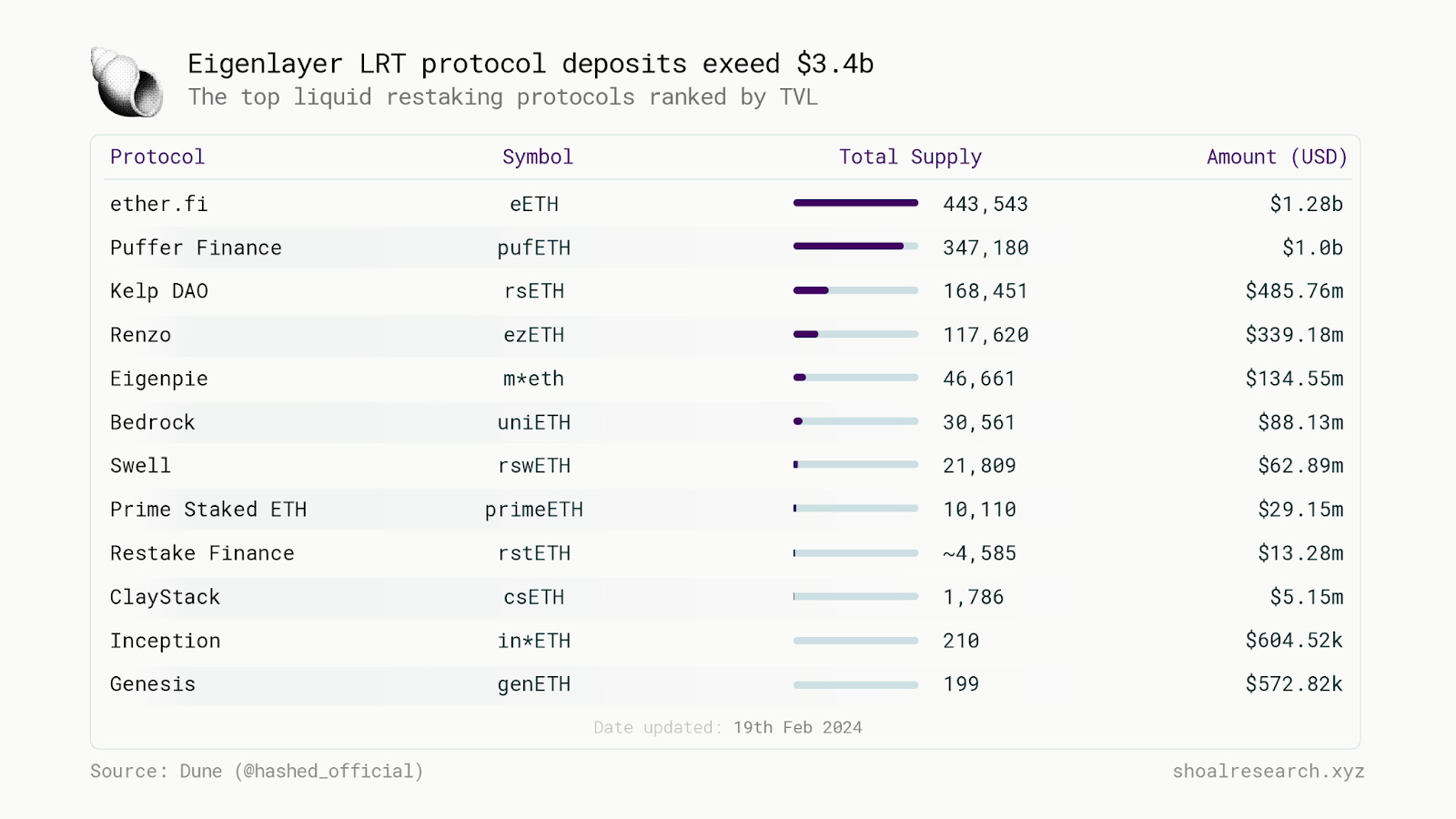 Etherfi - Etherfi enables users to deposit ETH to be natively restaked with Eigenlayer. The protocol has the highest value of deposits among all liquid restaking protocols ($1.1B) and is one of the few restaking protocols to have enabled withdrawals for users. Stakers retain custody of their ETH while delegating stake, and Etherfi mints an NFT for every validator launched through the protocol.