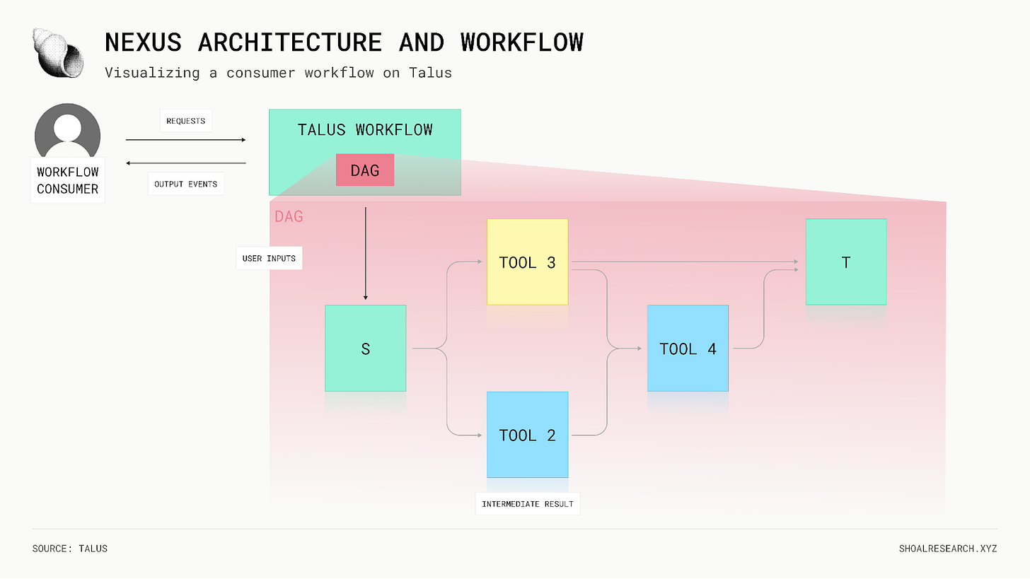 A consumer submits a request to a Talus workflow, which is encoded as a directed acyclic graph (DAG). Each step in the DAG corresponds to a tool invocation or state transition. During execution, the Nexus onchain packages coordinate with Leaders offchain to trigger tools, update workflow state, and return results. This separation between workflow specification (onchain) and computation (offchain) allows Talus to remain verifiable without sacrificing performance.