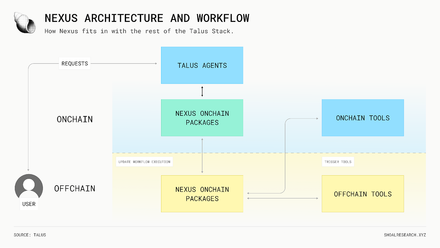 Nexus sits at the center of execution flow: agents submit workflow requests onchain, Nexus updates workflow state, and Leaders coordinate offchain execution by invoking the appropriate tools and returning results onchain. This separation between onchain coordination and offchain computation is what enables Talus to remain both verifiable and performant.