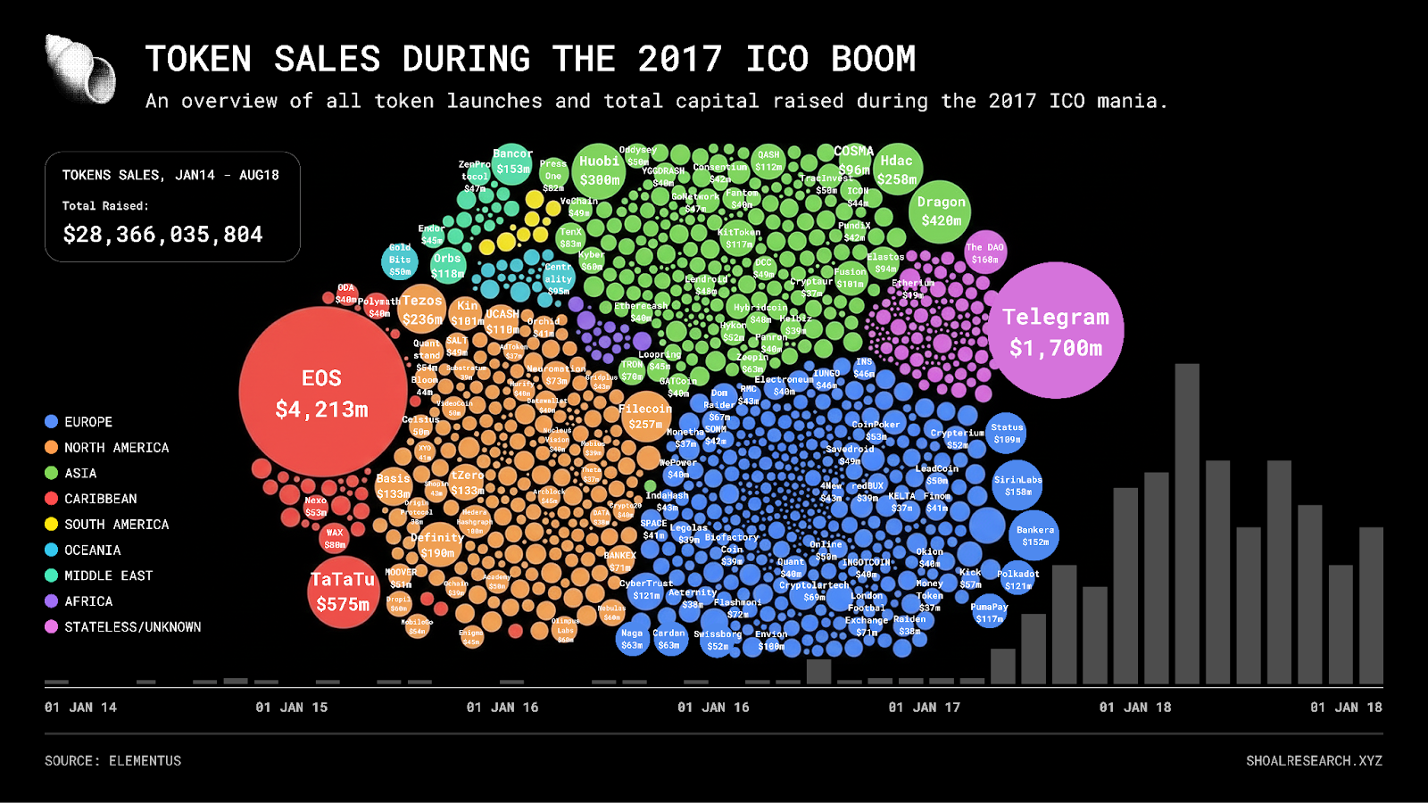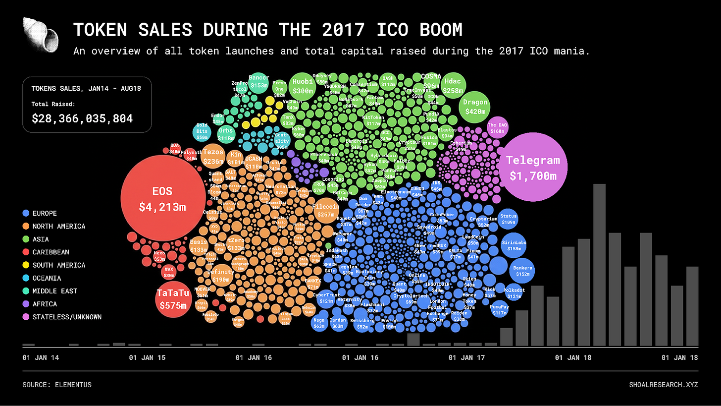This was a real breakthrough with huge potential. As people began experimenting with this new model, interest exploded, ultimately leading to the historic ICO boom of 2017, where millions were raised and thousands of new tokens were launched.