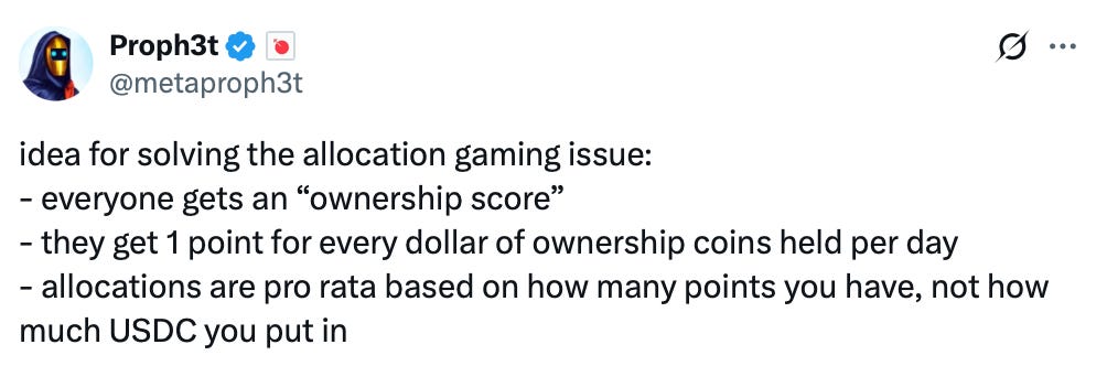 In the longer term, they are exploring a system, where everyone would have a “Ownership score” based on how much “ownership coin” they help, and higher scores receive better allocation. This would help ensure that high-quality, long-term holders are prioritized.