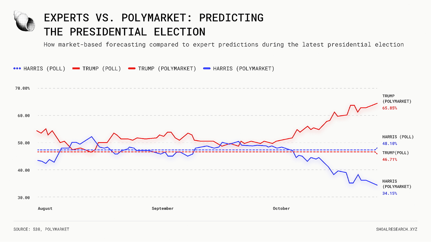 The core axiom behind this model is that markets aggregate information more efficiently than traditional voting, and that the collective incentives of traders produce better predictions than the opinions of a small group. In fact, we already see this dynamic in practice through the accuracy of prediction markets: during the last presidential election, for example, platforms like Polymarket delivered far more accurate forecasts than professional pollsters.