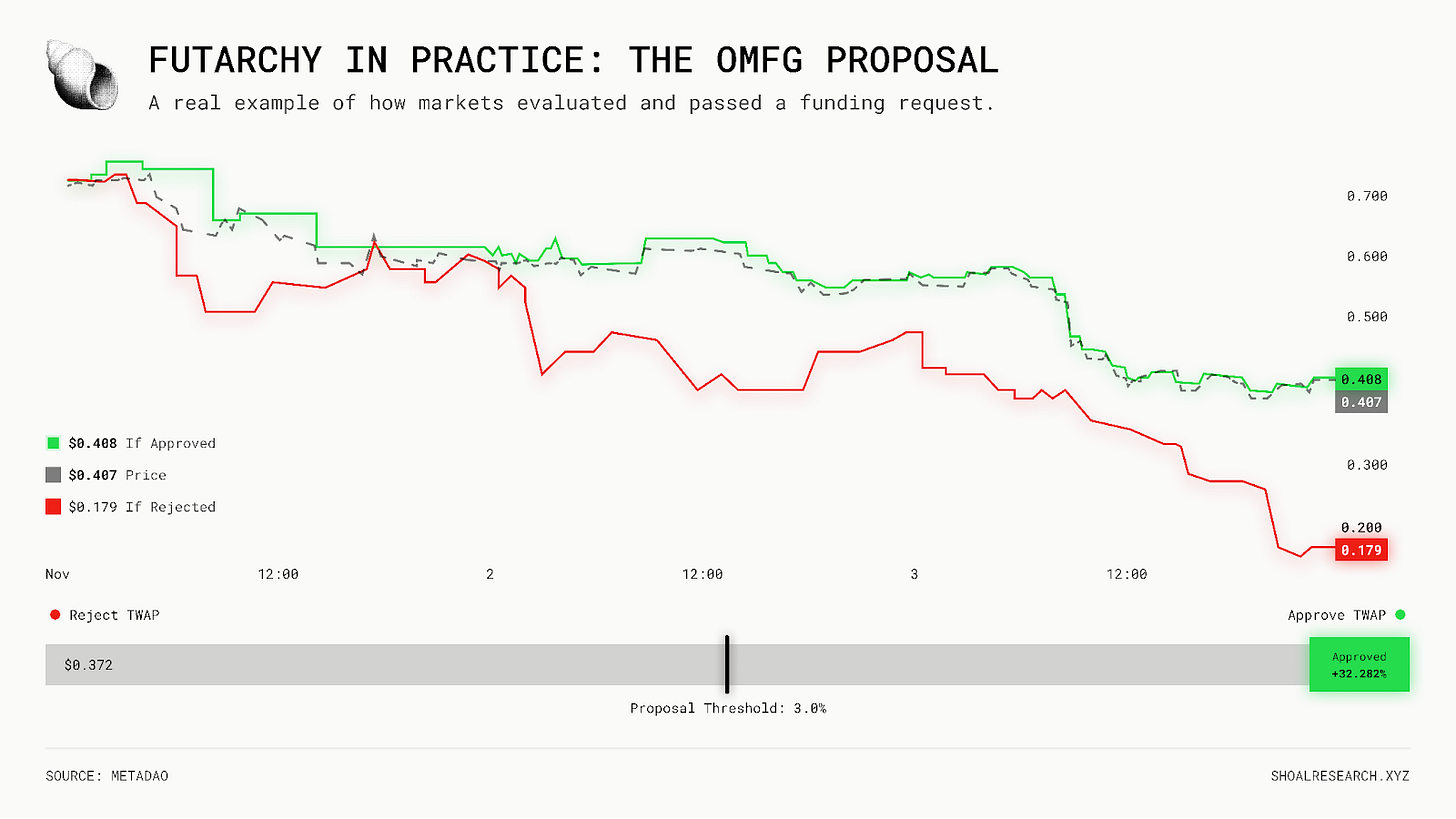 Instead of debating proposals in endless forums and then voting, futarchy embraces the power of markets to forecast which decisions will be best. Proposals pass when the market speculates that they’re good. Proposals fail when the market speculates that they’re bad.