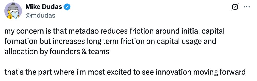 While we can argue that MetaDAO decreases friction around capital formation, the model increases long-term friction on capital usage by teams. This is an important consideration. If a founder needs to get something done but the market rejects proposals by a tiny margin because of a small clause in a document and not enough traders are actively trading on it. We can argue that this might not be the best use of a founder’s time, and repeated failed proposals could slow execution rather than accelerate it.