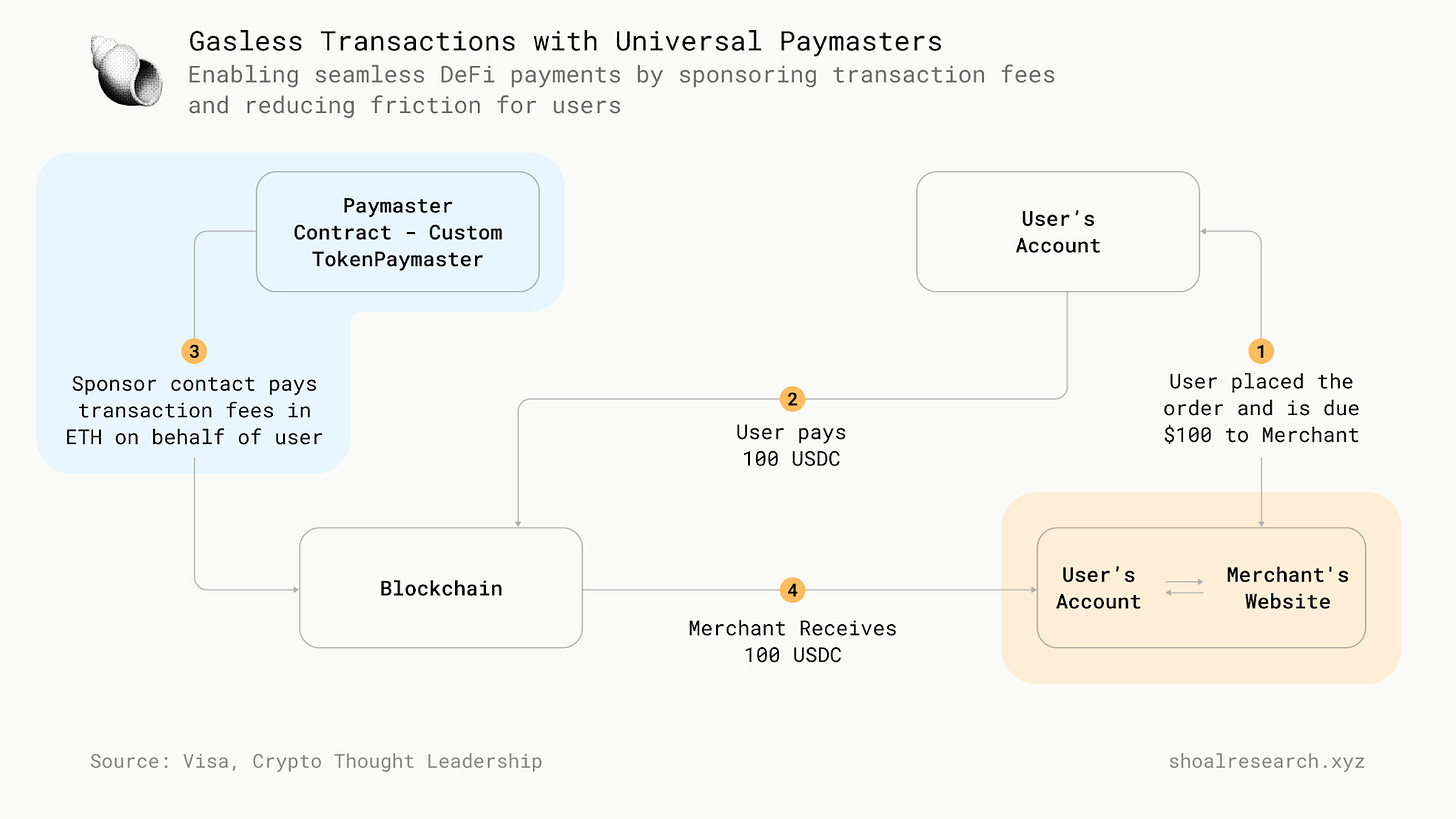 Another challenge in DeFi is that gas fees create an unpredictable cost structure, making transactions expensive and sometimes unprofitable. When using any assets on a chain, let’s say you're sending an ERC-20 token $X from Ethereum, you would have to pay gas in the native currency of that chain (in this case, ETH). Many users abandon transactions as they might not have any liquid native tokens to pay for the gas. Universal Gas Paymaster solutions remove this complexity by allowing users to pay transaction fees in any token, making DeFi interactions more seamless. This is especially important for institutional players who need cost predictability before deploying large amounts of capital into on-chain strategies. Universal Gas Paymasters are also useful to networks or dApps that plan to implement gasless transactions to bolster user acquisition. This concept known as “sponsored transaction fees”, depicted in the graphic below, is a surefire way to support user growth by lowering barriers and switching costs for prospective users.