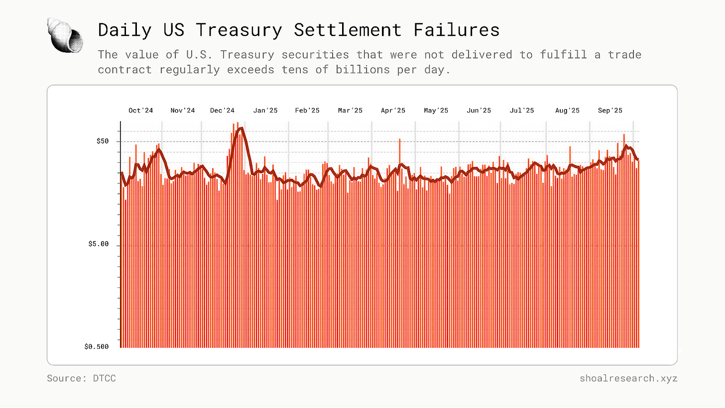 The DTCC reports that tens of billions of dollars in daily settlement failures. These failures rarely occur in isolation; when one security fails to arrive, it often has already been pledged as part of another transaction. That second trade then fails, potentially a third after it, effectively creating a cascade of failures which are only amplified in markets with high leverage and thin liquidity.