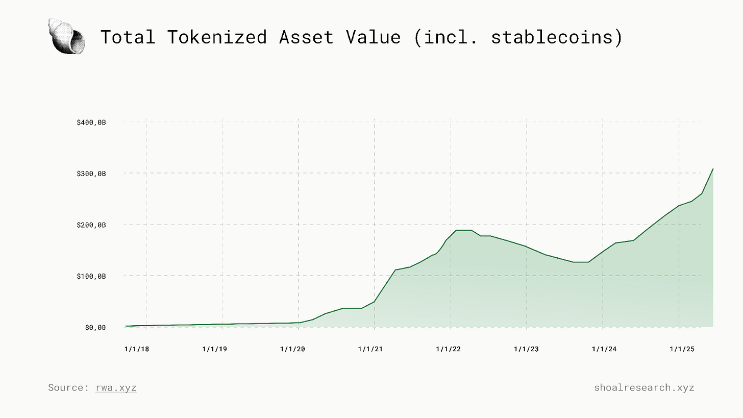 Tokenization has momentum, but its footprint remains small: tokenized assets including government bonds, credit, and equities still represent only a fraction of global financial markets, estimated at less than 0.2% of the roughly $500 trillion in total assets worldwide. Stablecoins continue to dominate onchain liquidity, with over $300 billion in aggregate supply dwarfing the combined value of all tokenized assets on public chains. The advantages of tokenization are clear: operational efficiency, near-instant settlement, 24/7 access, transparency, and programmability for functions like automated compliance or dynamic asset management.
