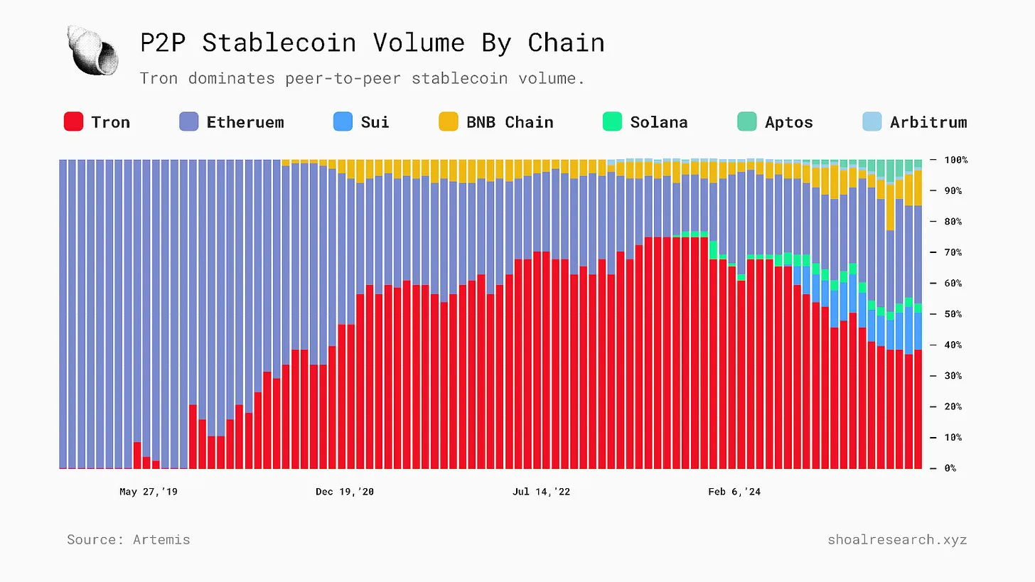 These distributions reveal two different types of utility. Ethereum dominates in DeFi-related usage (i.e. liquidity pools, lending markets, and settlement) while Tron leads in peer-to-peer transfer volume, especially across emerging markets where low fees and quick confirmations make it ideal for payments and remittances.
