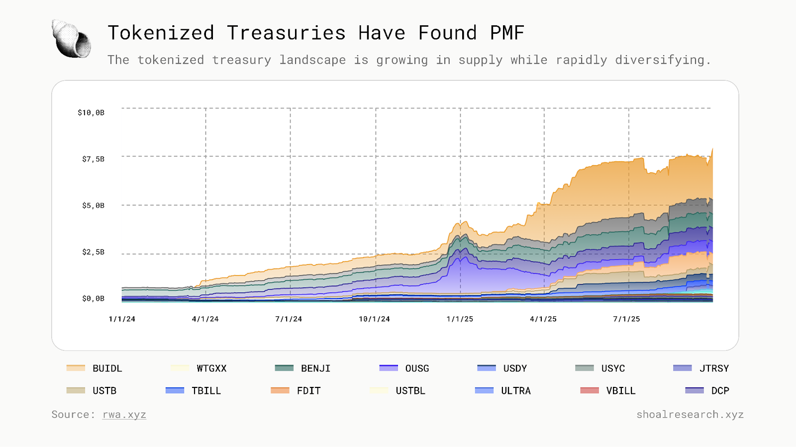 If stablecoins effectively functioned as a blueprint for tokenization, treasuries are emerging as the rising phoenix. At the time of writing, tokenized Treasuries have reached upwards of $8B marking more than an 80% increase YTD. That growth has well outpaced the early trajectory of stablecoins, reflecting growing demand for yield-bearing, low-risk assets that can serve as collateral and liquidity instruments across global markets.