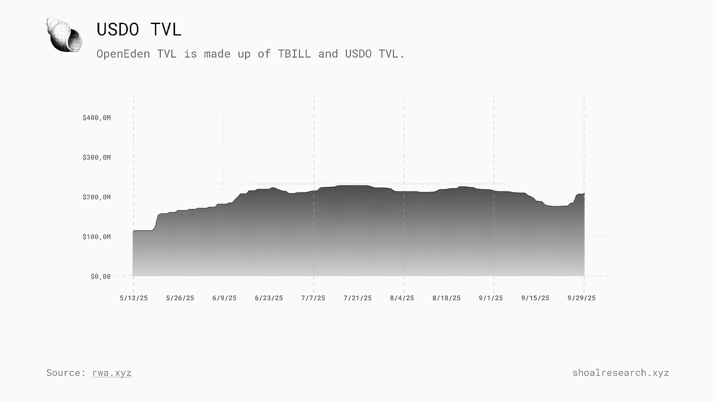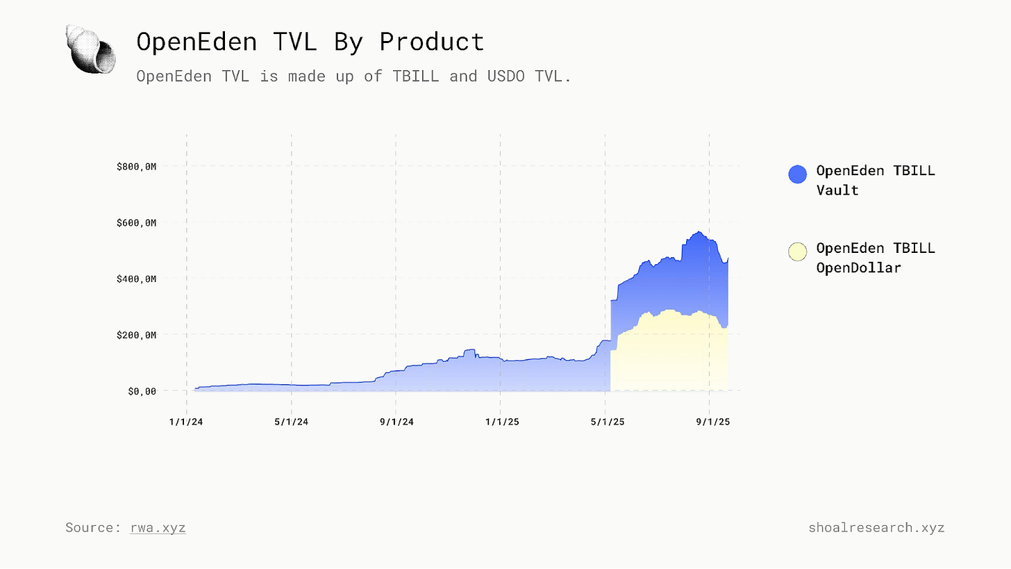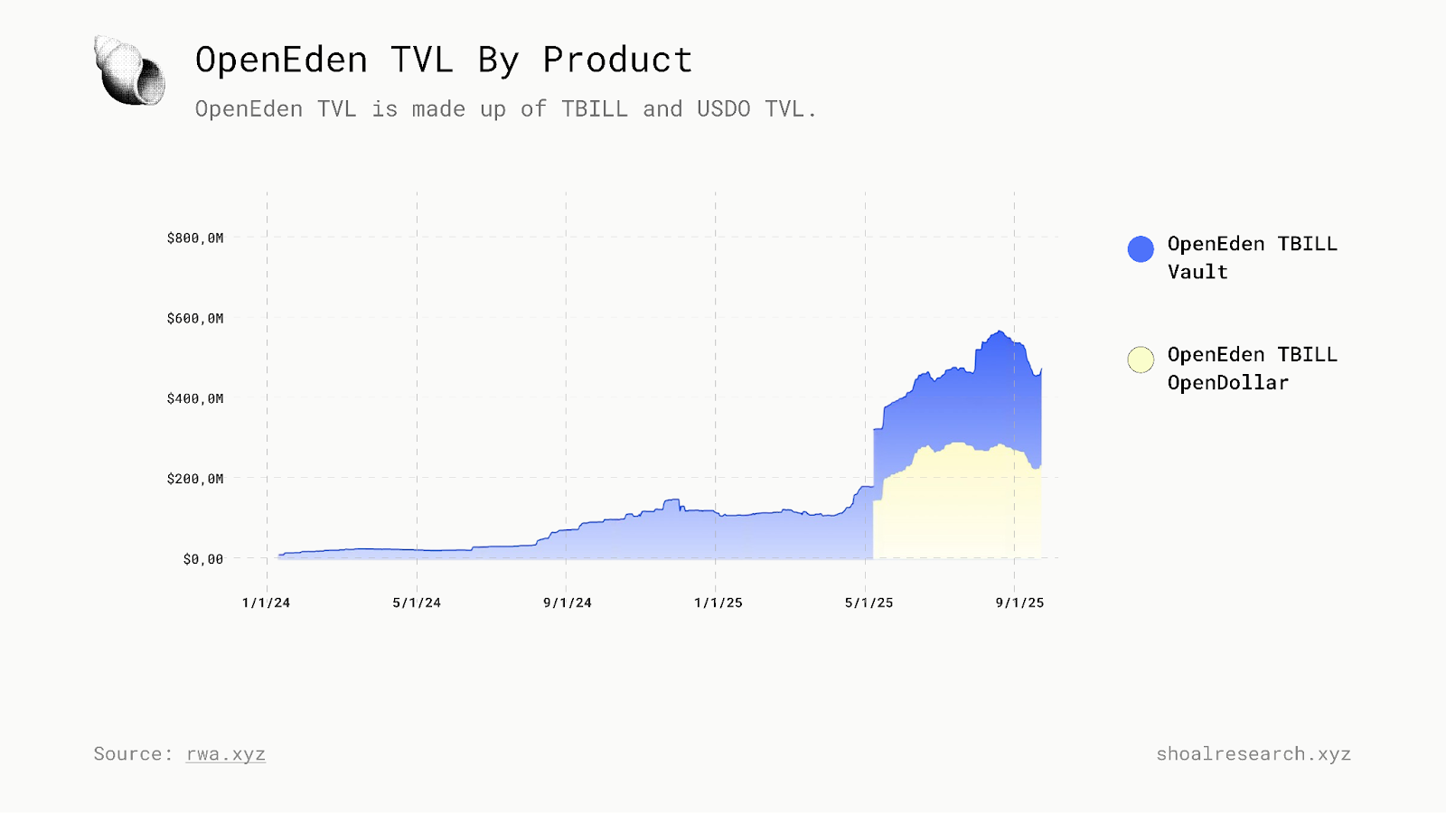 Total value locked, which currently sits at $531M, has climbed sharply YTD, driven by consistent inflows into TBILL, OpenEden’s tokenized Treasury product, and USDO, its stablecoin, which each have amassed ~$266M and ~$264M in TVL respectively.