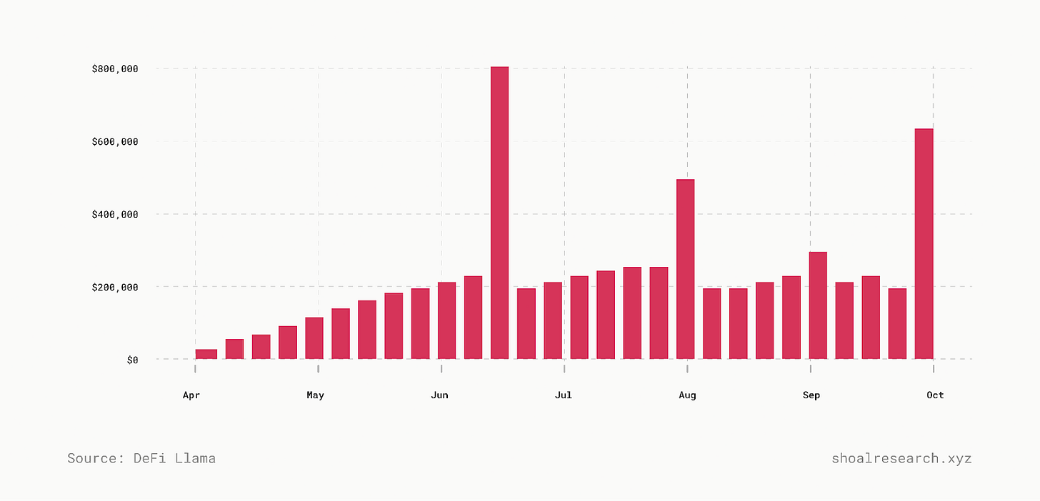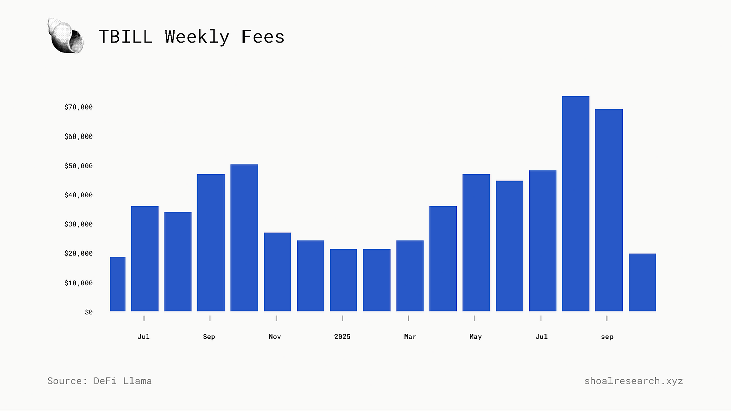 TBILL has also consistently generated tens of thousands in fees since early 2024, amassing $624K total fees to date.