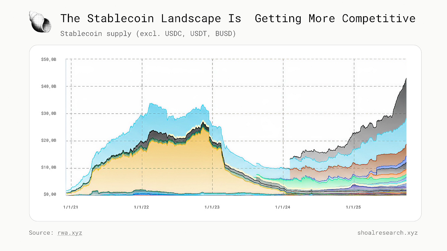 Stablecoins present a different challenge. Supply remains highly concentrated in a few dominant issuers (USDT, USDC) which together account for well over 90 percent of circulating volume. However, zooming out, if we exclude USDT, USDC, and BUSD supply, it’s becoming evident that stablecoins, like treasuries and the rest of the tokenization landscape, is only going to become more competitive soon.