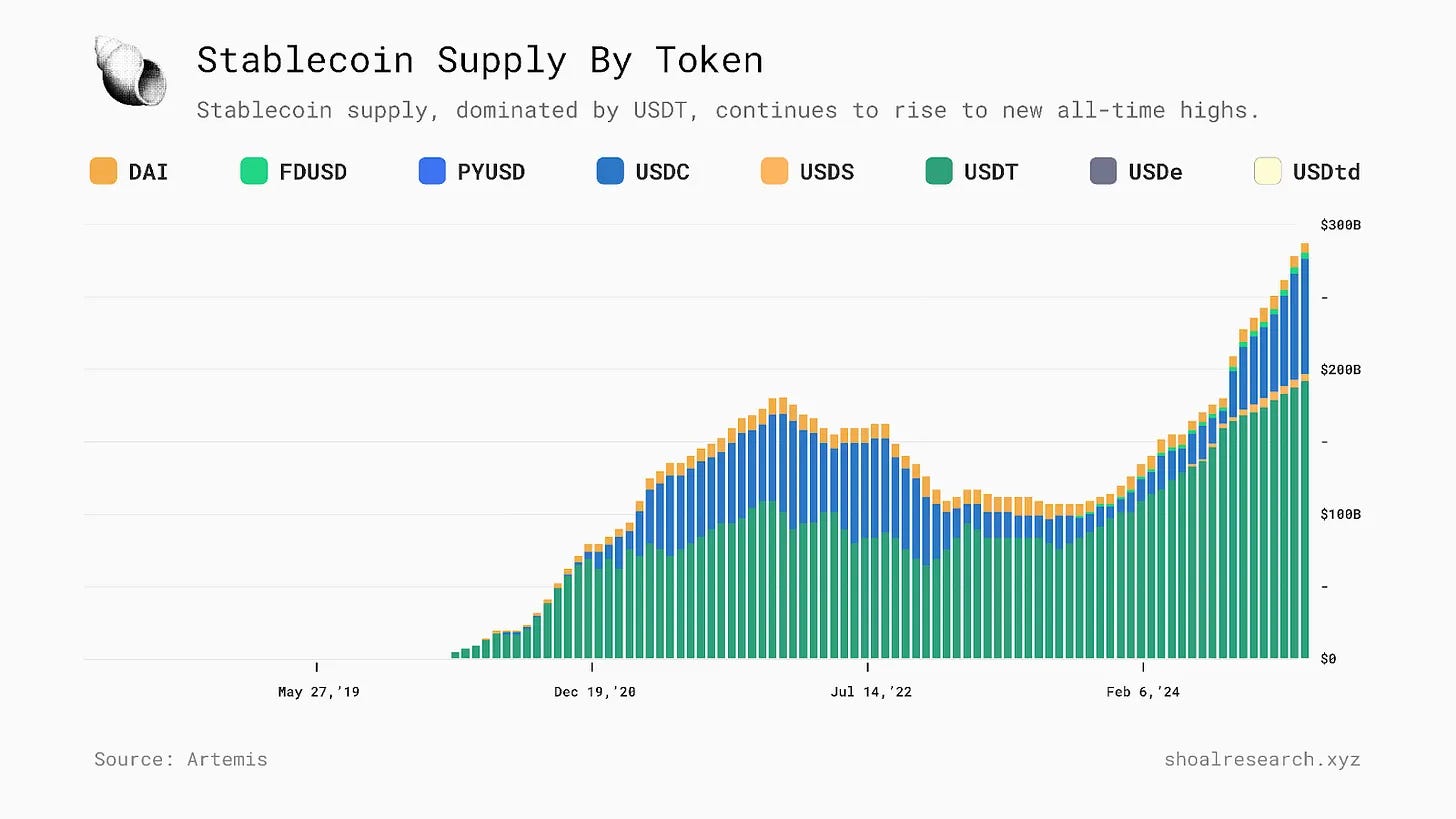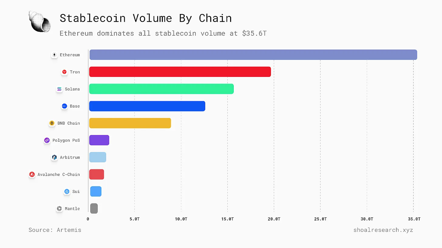 By chain, Ethereum still leads in aggregate supply and transaction value, but Tron, Solana, and Base have grown rapidly.
