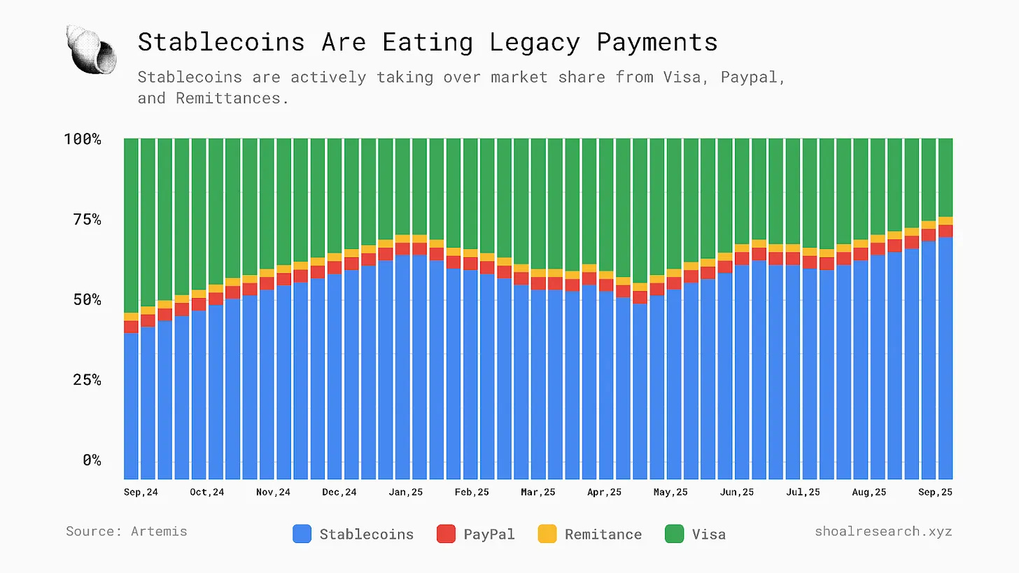 More impressively, though, stablecoins are already eroding legacy payment networks. Aggregate transfer volumes now reach into the trillions per month, rivaling networks like Visa, Mastercard, and SWIFT, but with near-instant settlement and materially lower transaction costs.