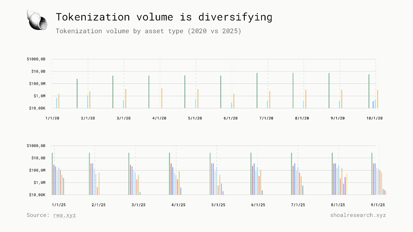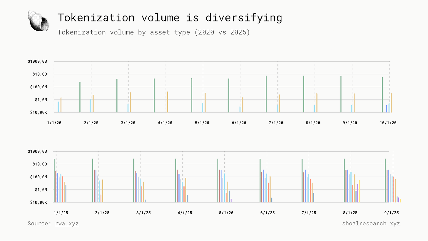 Given >99% of circulating stablecoin supply is made up of US Dollar backed stablecoins, we can effectively think of them as tokenized dollars: their supply onchain is backed 1:1 by reserves held in assets like dollars and treasuries. Stablecoins have stood the test of time and have seen remarkable growth in supply, which sits at just over $300B today. That said, if we observe monthly issuance volume of tokenized assets 5 years ago vs year-to-date, it’s clear the appetite for tokenization extends well beyond just digital dollars now.