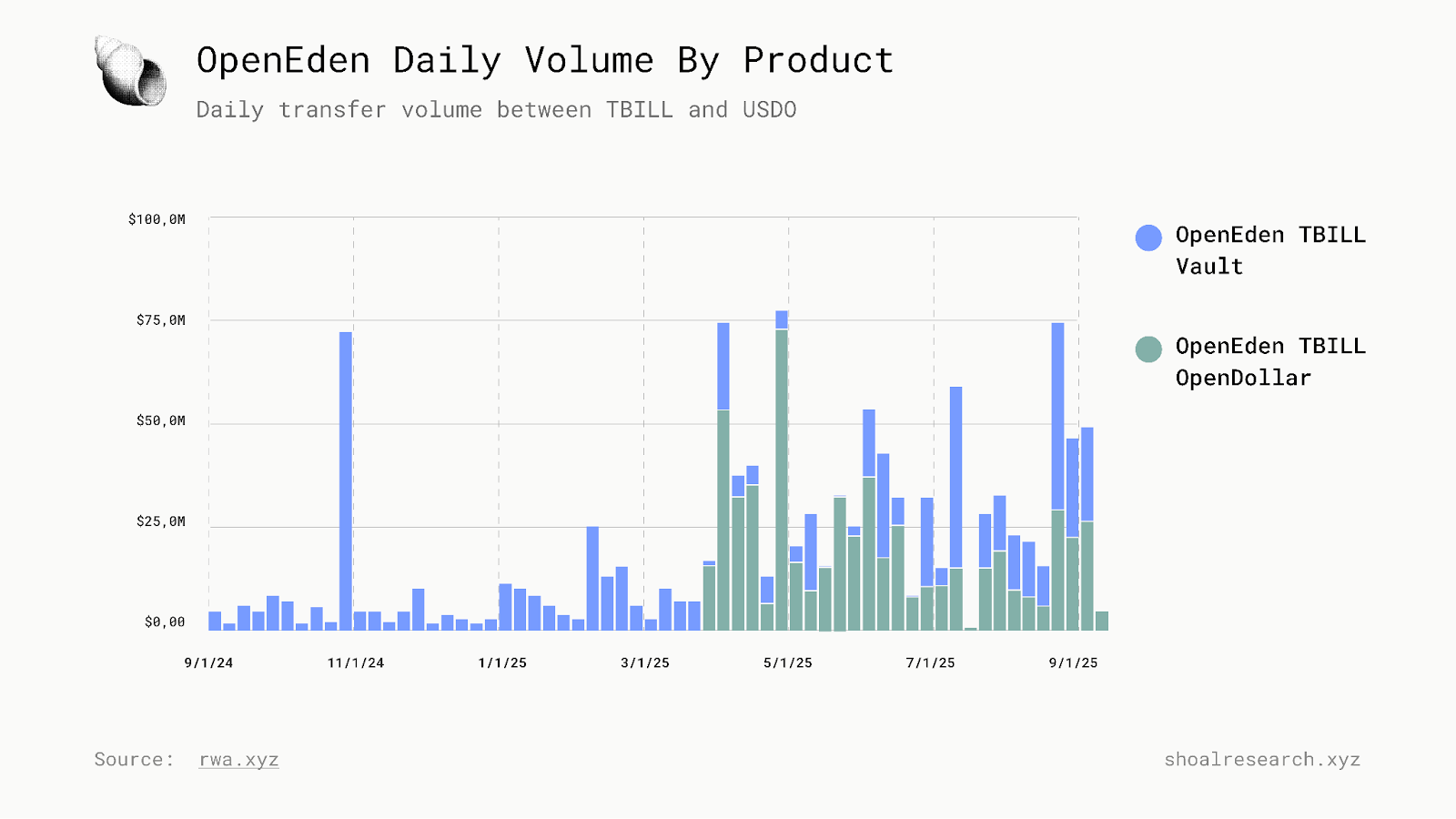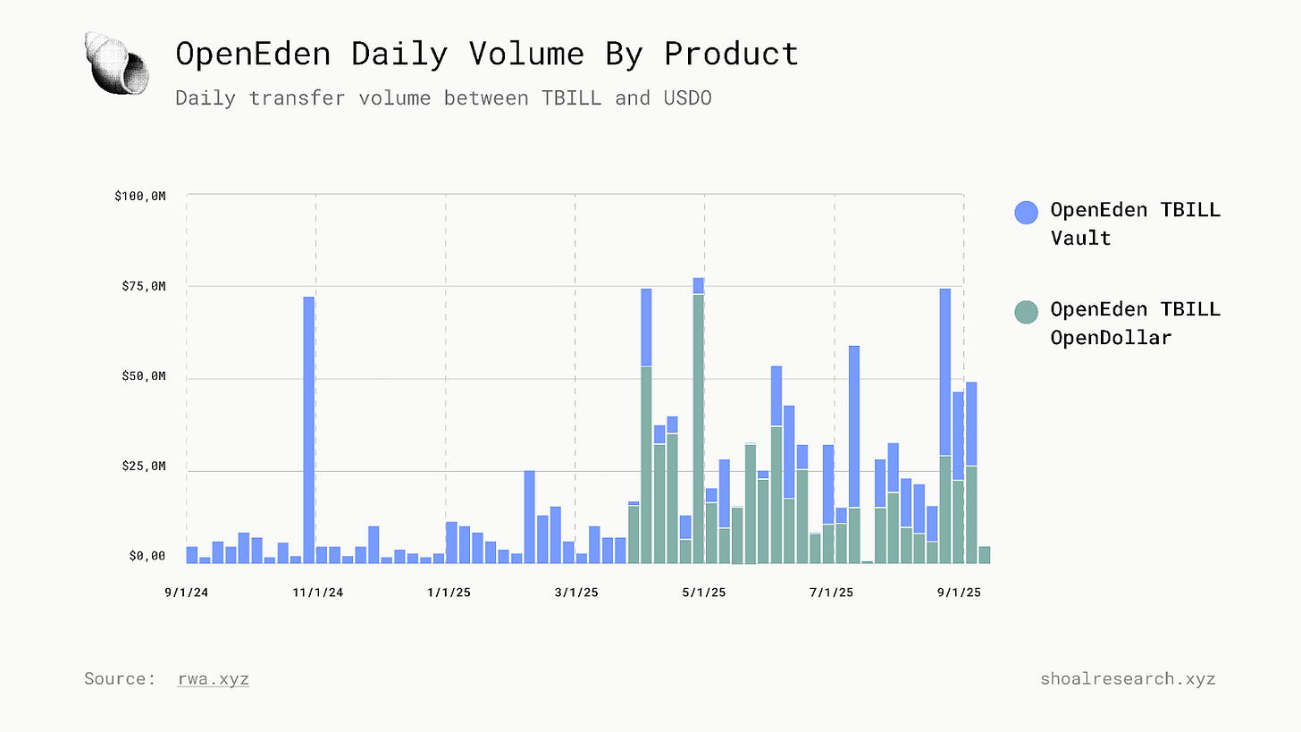 Transaction data shows a steady rise in usage, with daily transfer volumes across OpenEden’s products now reaching parity between TBILL and USDO, the latter of which was notably launched at a later time.