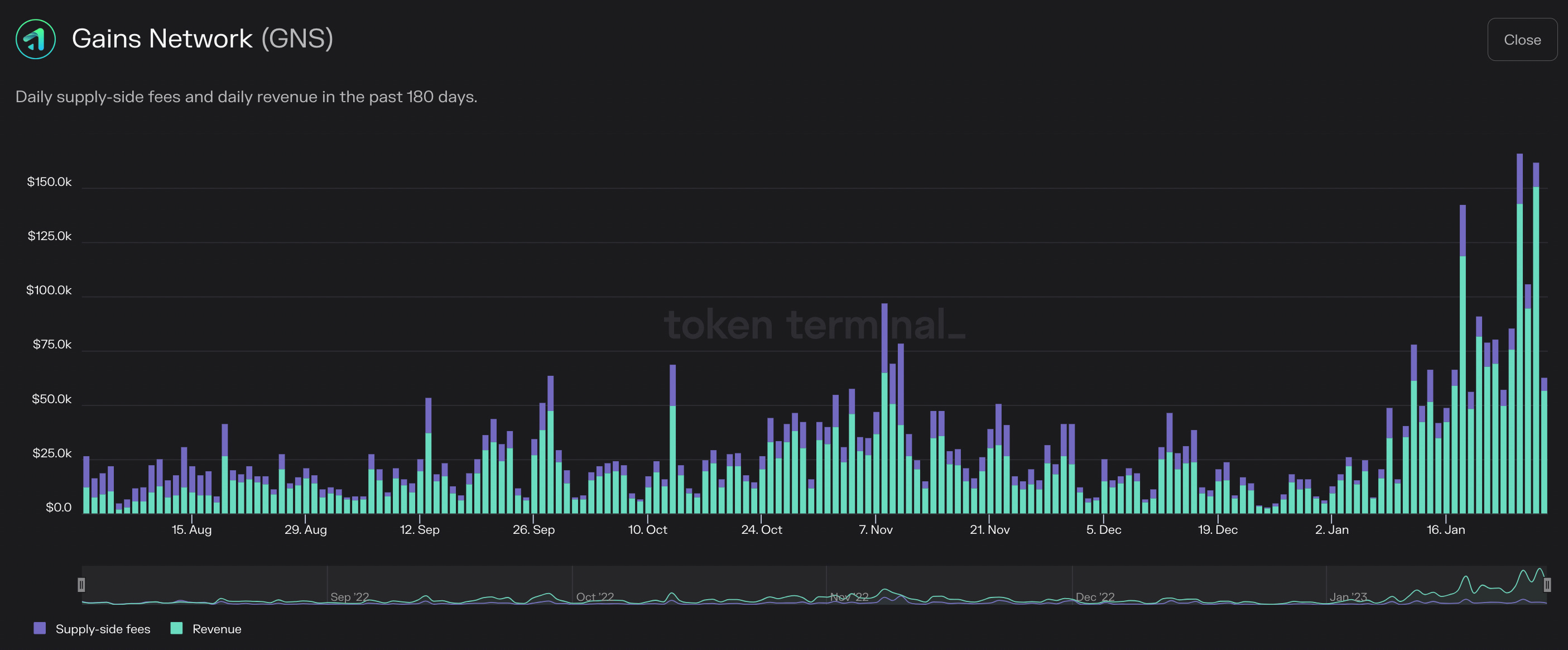Gains is one of the most profitable protocols in crypto. The protocol takes fees from trading and distributes them back to $GNS holders in $DAI stablecoin. Unlike many token ecosystems with many token emissions, gains have a profitable business model.