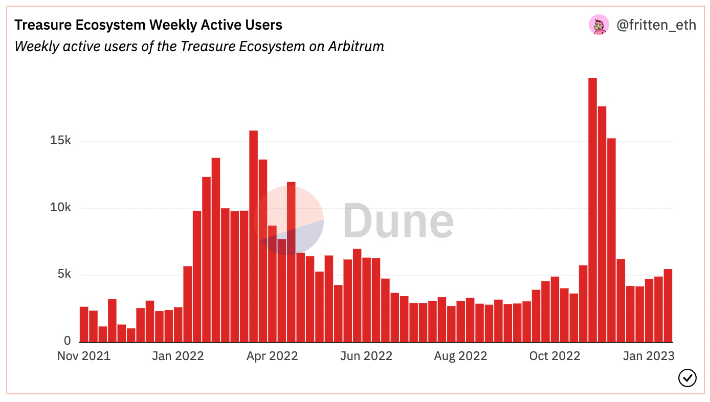 TreasureDao is the largest NFT and gaming ecosystem on Arbitrum and positions its economy around the $MAGIC token. Magic is the ecosystem token that game developers can build upon and integrate into their games. There will likely be tremendous value accrual to $MAGIC if one game becomes viral in their growing ecosystem. TreasureDao has 10+ integrated games.