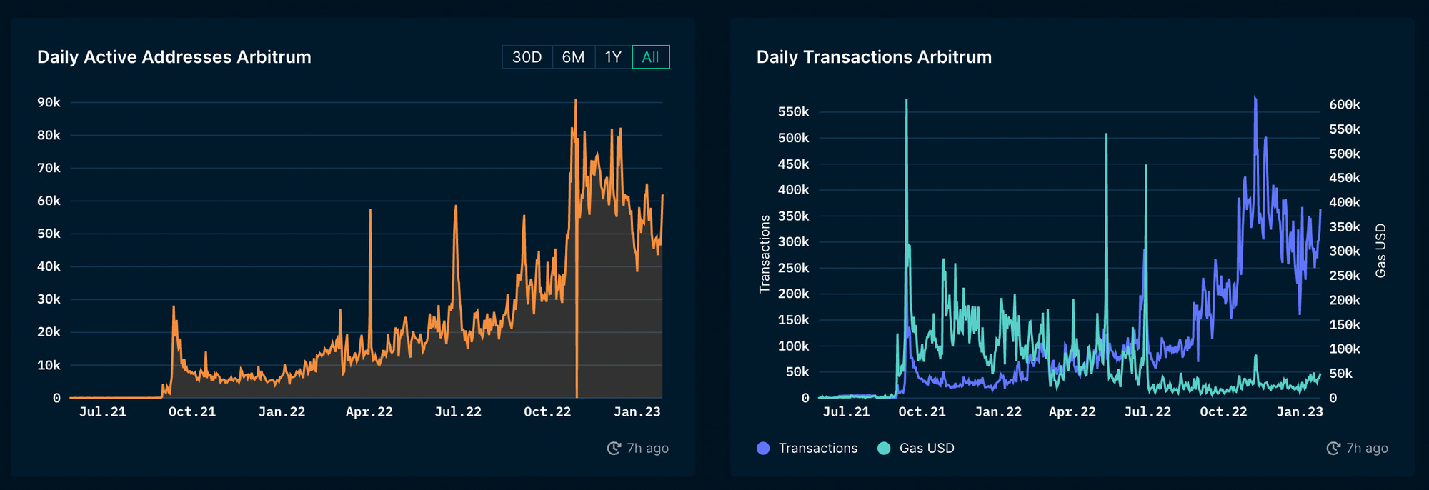 Arbitrum has maintained solid network usage even throughout a bear market. The numbers continue to grow on both the daily user side and transactions.