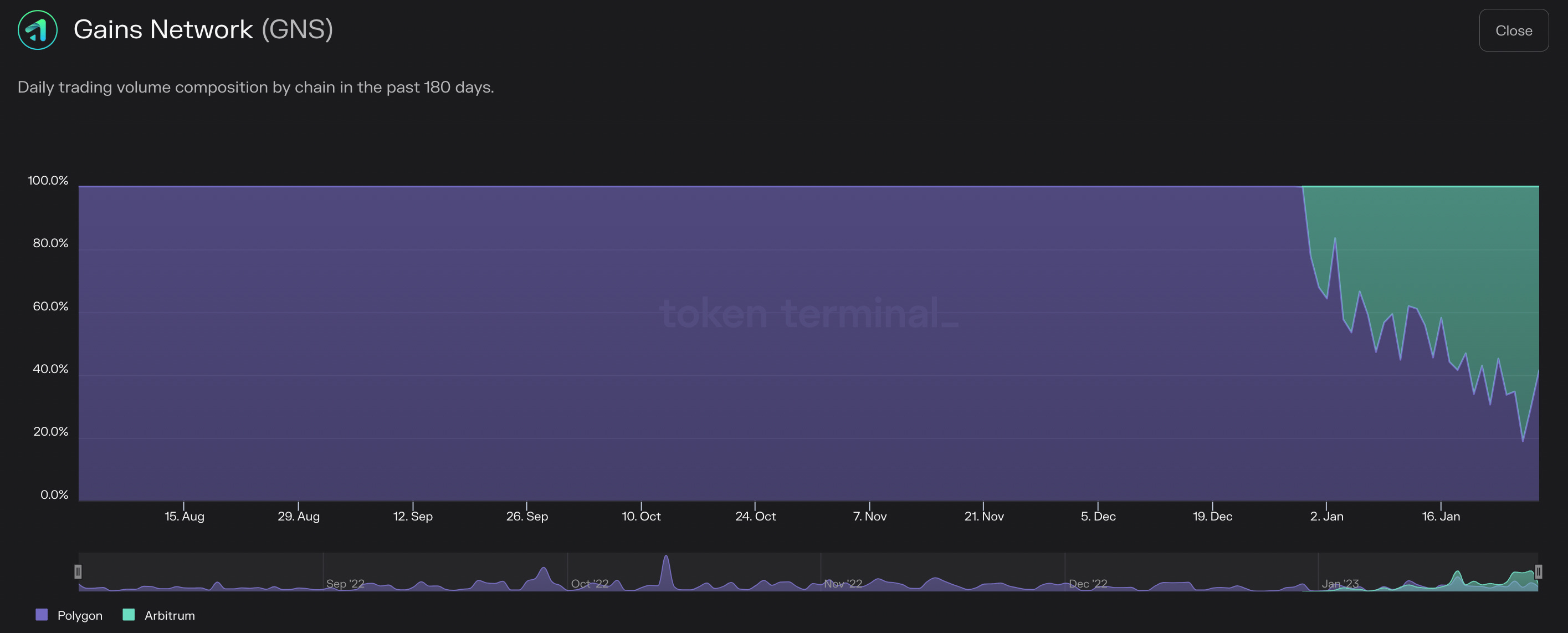 Gains network is one of the hottest protocols to enter Arbitrum. Gains network is a one-click decentralized leveraged trading platform. Their platform users to enter leveraged positions on crypto, forex, and stocks. Lately, Gains has nearly flipped GMX trading volume. In January, Gains saw a surge in trading volume from launching on Arbitrum. This strategic move has propelled their revenue-capturing flywheel.